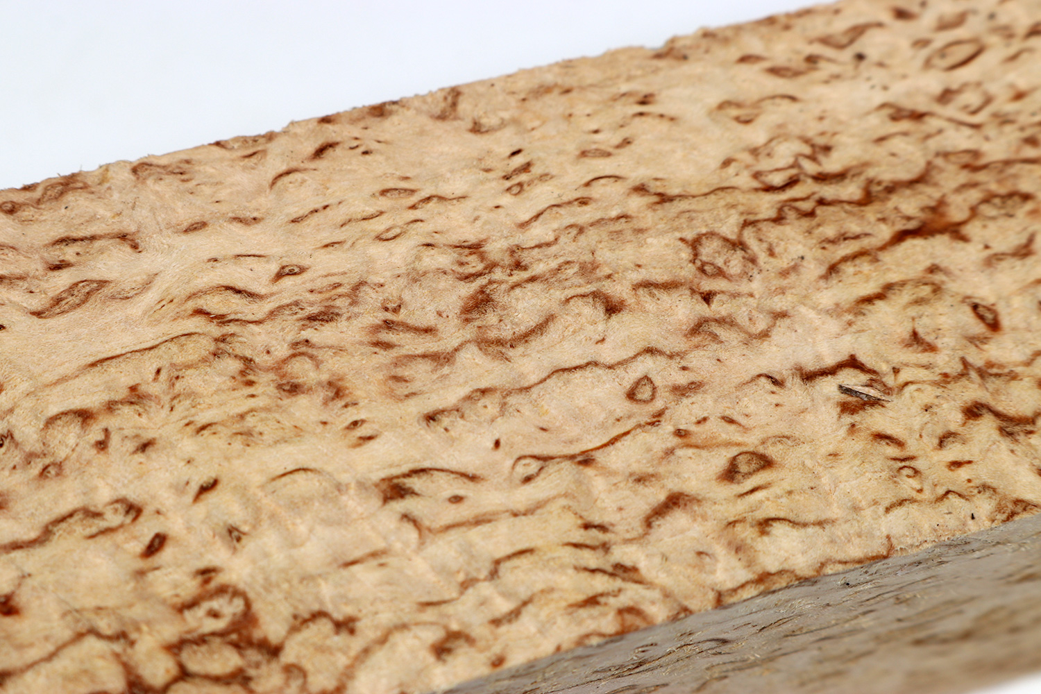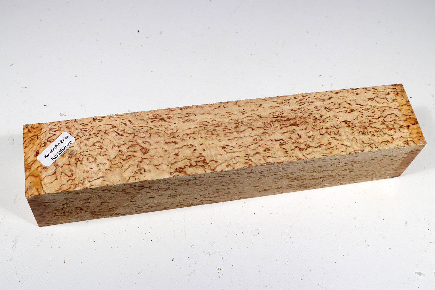 Die Karelische Maserbirke (Betula pendula var. carelica) kommt in der Grenzregion zwischen Rußland und Ostfinnland, dem sogenannten Karelien vor. Es ist einfach DAS klassische Holz für nordische Messer aller Art, wie z.B. Sami-Messer. Eine Verwendbarkeit für größere Objekte schließt sich auf Grund der eher geringen Dimensionen von selbst aus (die Stämme haben üblicherweise einen Durchmesser von lediglich 10-20 cm). Gut gemaserte Stämme sind verhältnissmäßig selten und begehrt. Das typische Aussehen in Form der braunen Adern ist einzigartig und kommt bei keinem anderen Maserholz vor.