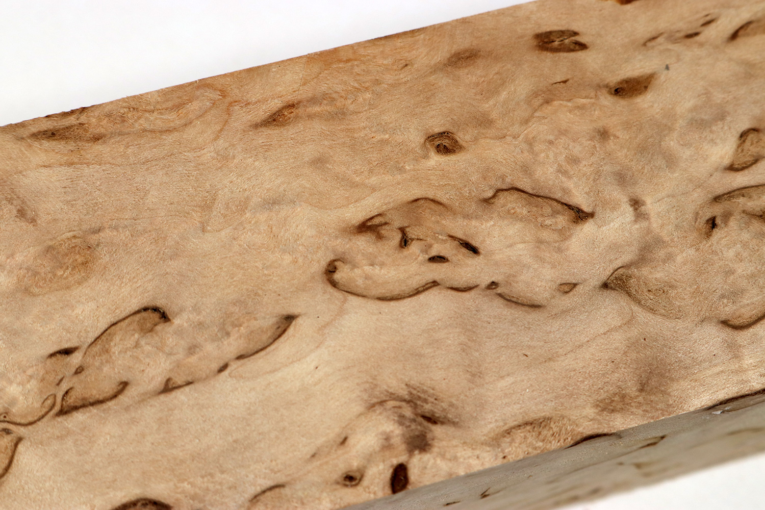 Die Karelische Maserbirke (Betula pendula var. carelica) kommt in der Grenzregion zwischen Rußland und Ostfinnland, dem sogenannten Karelien vor. Es ist einfach DAS klassische Holz für nordische Messer aller Art, wie z.B. Sami-Messer. Eine Verwendbarkeit für größere Objekte schließt sich auf Grund der eher geringen Dimensionen von selbst aus (die Stämme haben üblicherweise einen Durchmesser von lediglich 10-20 cm). Gut gemaserte Stämme sind verhältnissmäßig selten und begehrt. Das typische Aussehen in Form der braunen Adern ist einzigartig und kommt bei keinem anderen Maserholz vor.