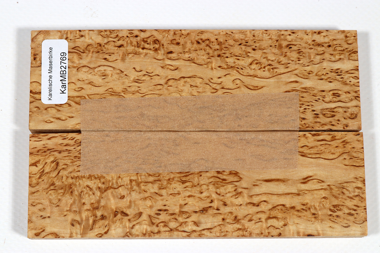 Die Karelische Maserbirke (Betula pendula var. carelica) kommt in der Grenzregion zwischen Rußland und Ostfinnland, dem sogenannten Karelien vor. Es ist einfach DAS klassische Holz für nordische Messer aller Art, wie z.B. Sami-Messer. Eine Verwendbarkeit für größere Objekte schließt sich auf Grund der eher geringen Dimensionen von selbst aus (die Stämme haben üblicherweise einen Durchmesser von lediglich 10-20 cm). Gut gemaserte Stämme sind verhältnissmäßig selten und begehrt. Das typische Aussehen in Form der braunen Adern ist einzigartig und kommt bei keinem anderen Maserholz vor.