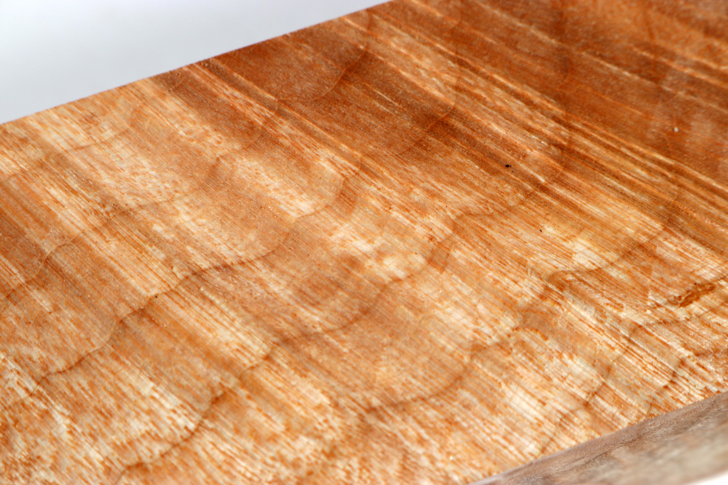 Zucker Ahorn (Muschelahorn) (Acer saccharum) ©Bruce Marlin Der Muschelahorn ist keine eigene Holzart, sondern ist ein Derivat des Zucker-Ahorn (Acer saccharum). Der herrliche 3D-Effekt, der sich aus der muschelartigen Maserung ergibt, entsteht nur vereinzelt am Stammansatz des Zuckerahorns. Im Zusammenhang mit den braunen Linien von Früh- und Spätholz ergibt sich ein sehr spektakulärer Effekt. Diese Spielart der Natur ist sehr selten und deshalb äusserst begehrt und relativ teuer. Der Zuckerahorn wächst in Nordamerika und Kanada und kann eine Höhe von 40m erreichen. Der Baum heisst nicht ohne Grund so, aus ihm wird der vor allem in Nordamerika konsumierte Ahornsirup gewonnen.