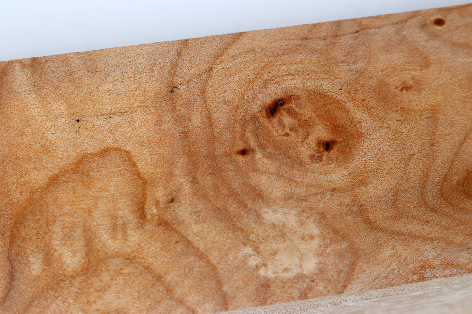 Zucker Ahorn (Muschelahorn) (Acer saccharum) ©Bruce Marlin Der Muschelahorn ist keine eigene Holzart, sondern ist ein Derivat des Zucker-Ahorn (Acer saccharum). Der herrliche 3D-Effekt, der sich aus der muschelartigen Maserung ergibt, entsteht nur vereinzelt am Stammansatz des Zuckerahorns. Im Zusammenhang mit den braunen Linien von Früh- und Spätholz ergibt sich ein sehr spektakulärer Effekt. Diese Spielart der Natur ist sehr selten und deshalb äusserst begehrt und relativ teuer. Der Zuckerahorn wächst in Nordamerika und Kanada und kann eine Höhe von 40m erreichen. Der Baum heisst nicht ohne Grund so, aus ihm wird der vor allem in Nordamerika konsumierte Ahornsirup gewonnen.