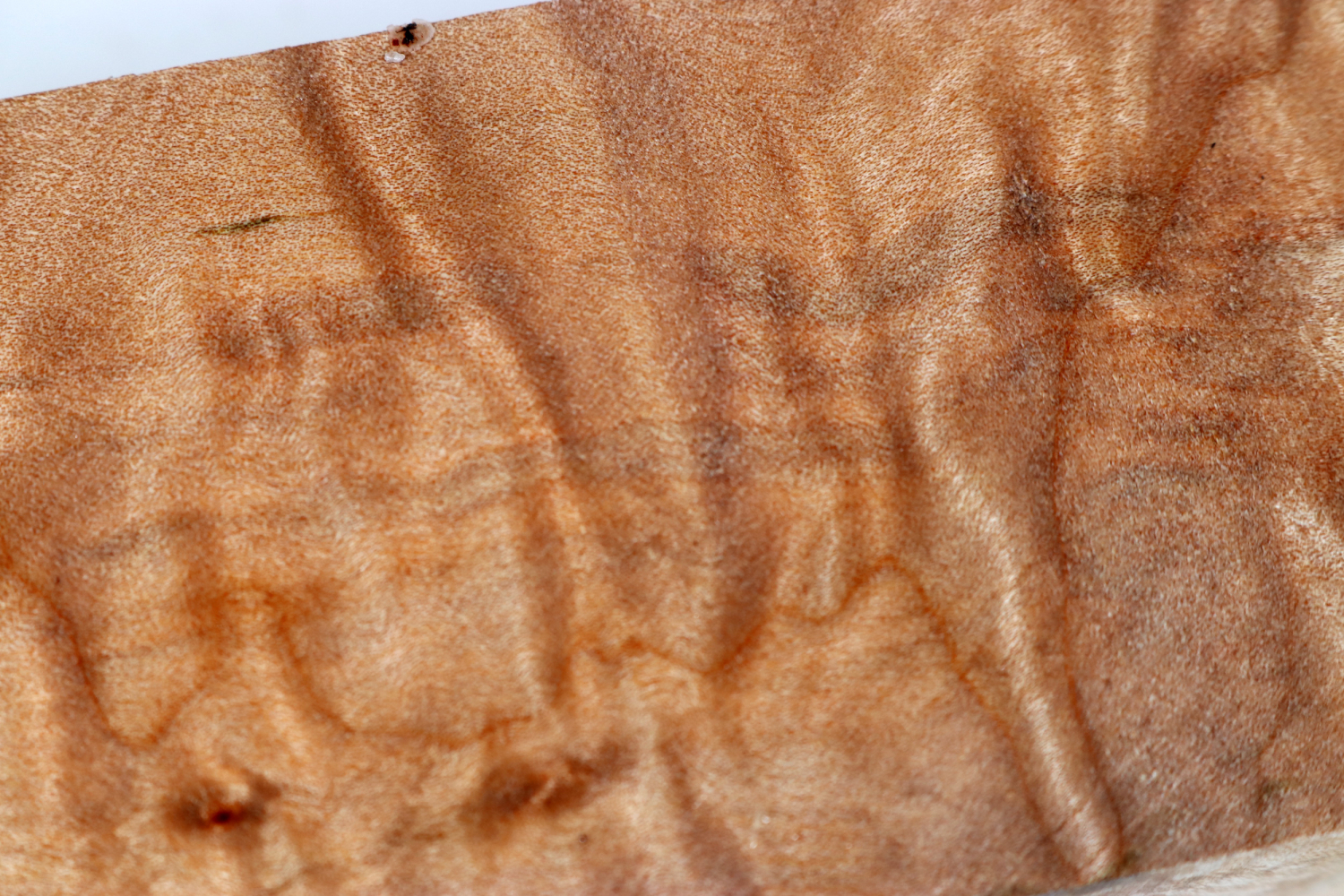 Zucker Ahorn (Muschelahorn) (Acer saccharum) ©Bruce Marlin Der Muschelahorn ist keine eigene Holzart, sondern ist ein Derivat des Zucker-Ahorn (Acer saccharum). Der herrliche 3D-Effekt, der sich aus der muschelartigen Maserung ergibt, entsteht nur vereinzelt am Stammansatz des Zuckerahorns. Im Zusammenhang mit den braunen Linien von Früh- und Spätholz ergibt sich ein sehr spektakulärer Effekt. Diese Spielart der Natur ist sehr selten und deshalb äusserst begehrt und relativ teuer. Der Zuckerahorn wächst in Nordamerika und Kanada und kann eine Höhe von 40m erreichen. Der Baum heisst nicht ohne Grund so, aus ihm wird der vor allem in Nordamerika konsumierte Ahornsirup gewonnen.