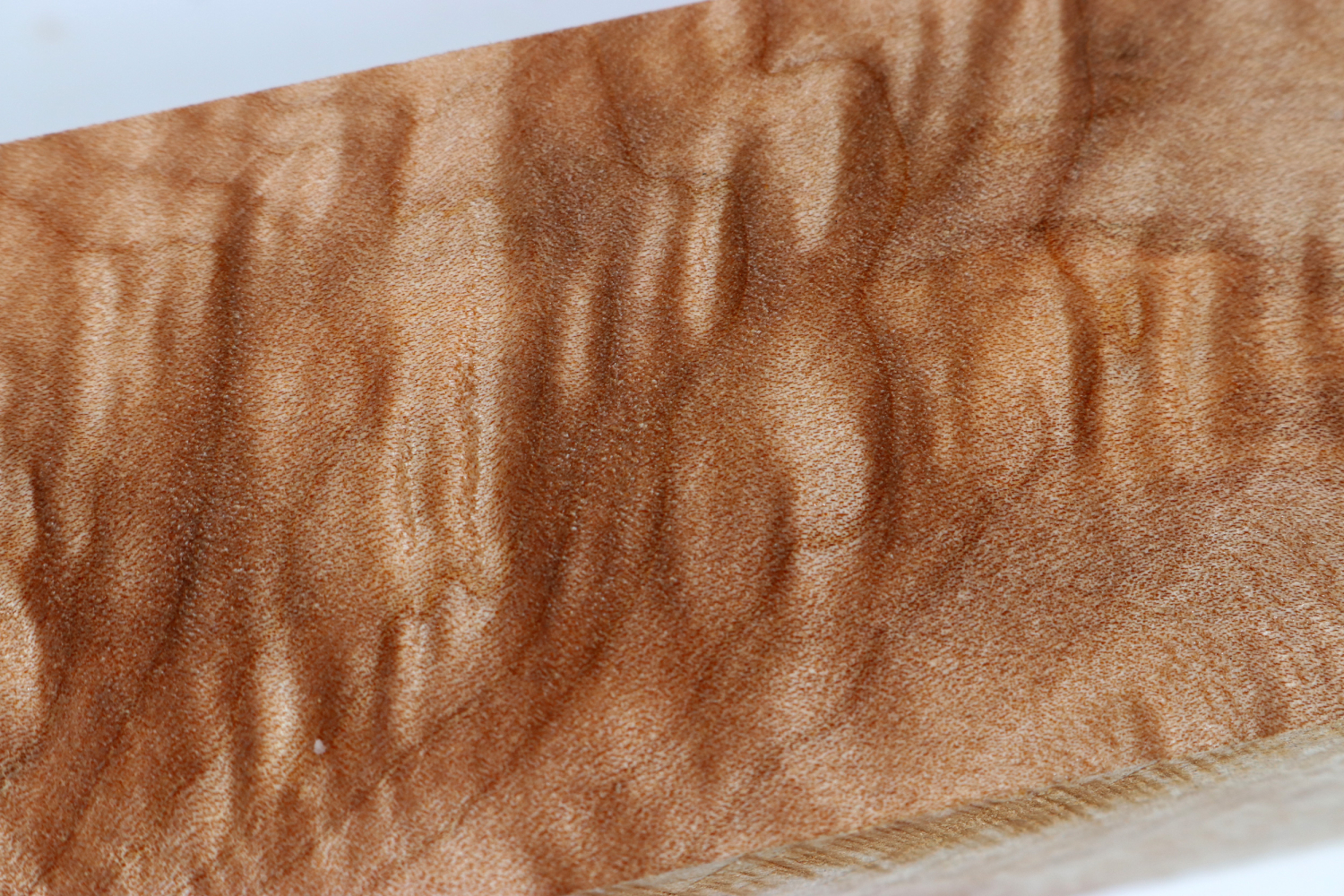 Zucker Ahorn (Muschelahorn) (Acer saccharum) ©Bruce Marlin Der Muschelahorn ist keine eigene Holzart, sondern ist ein Derivat des Zucker-Ahorn (Acer saccharum). Der herrliche 3D-Effekt, der sich aus der muschelartigen Maserung ergibt, entsteht nur vereinzelt am Stammansatz des Zuckerahorns. Im Zusammenhang mit den braunen Linien von Früh- und Spätholz ergibt sich ein sehr spektakulärer Effekt. Diese Spielart der Natur ist sehr selten und deshalb äusserst begehrt und relativ teuer. Der Zuckerahorn wächst in Nordamerika und Kanada und kann eine Höhe von 40m erreichen. Der Baum heisst nicht ohne Grund so, aus ihm wird der vor allem in Nordamerika konsumierte Ahornsirup gewonnen.