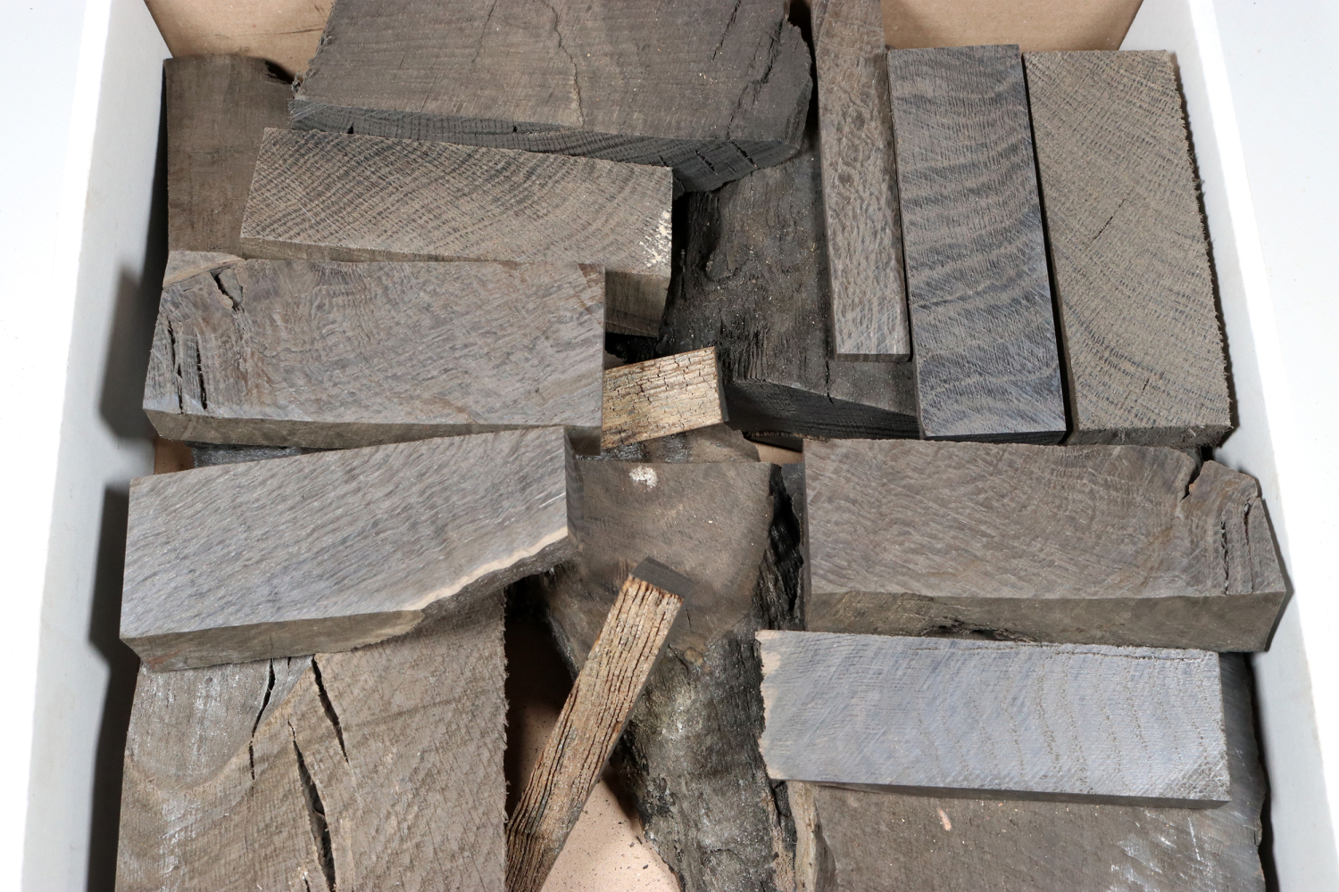 Eine stabile Klappbox aus Hartpappe (welche sich auch zum archivieren eignet), voll mit Edelholzabschnitten, Schnittresten und untermaßigen Stücken. Ideal für Schmuckhersteller und Designer oder Goldschmiede. Aber auch Modellbauer und Hobbybastler kleinerer Objekte werden hier fündig.
