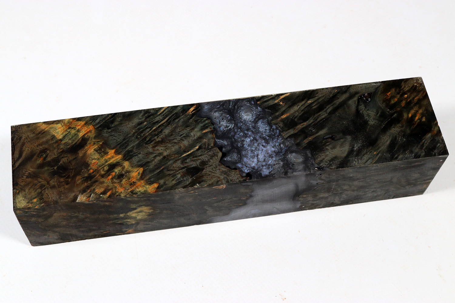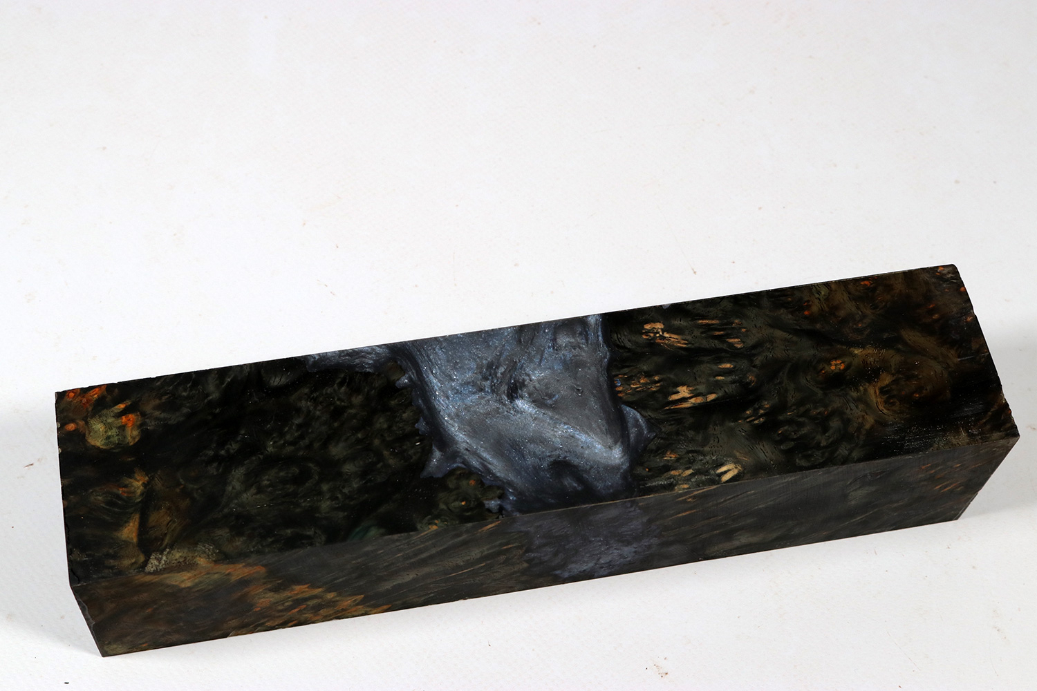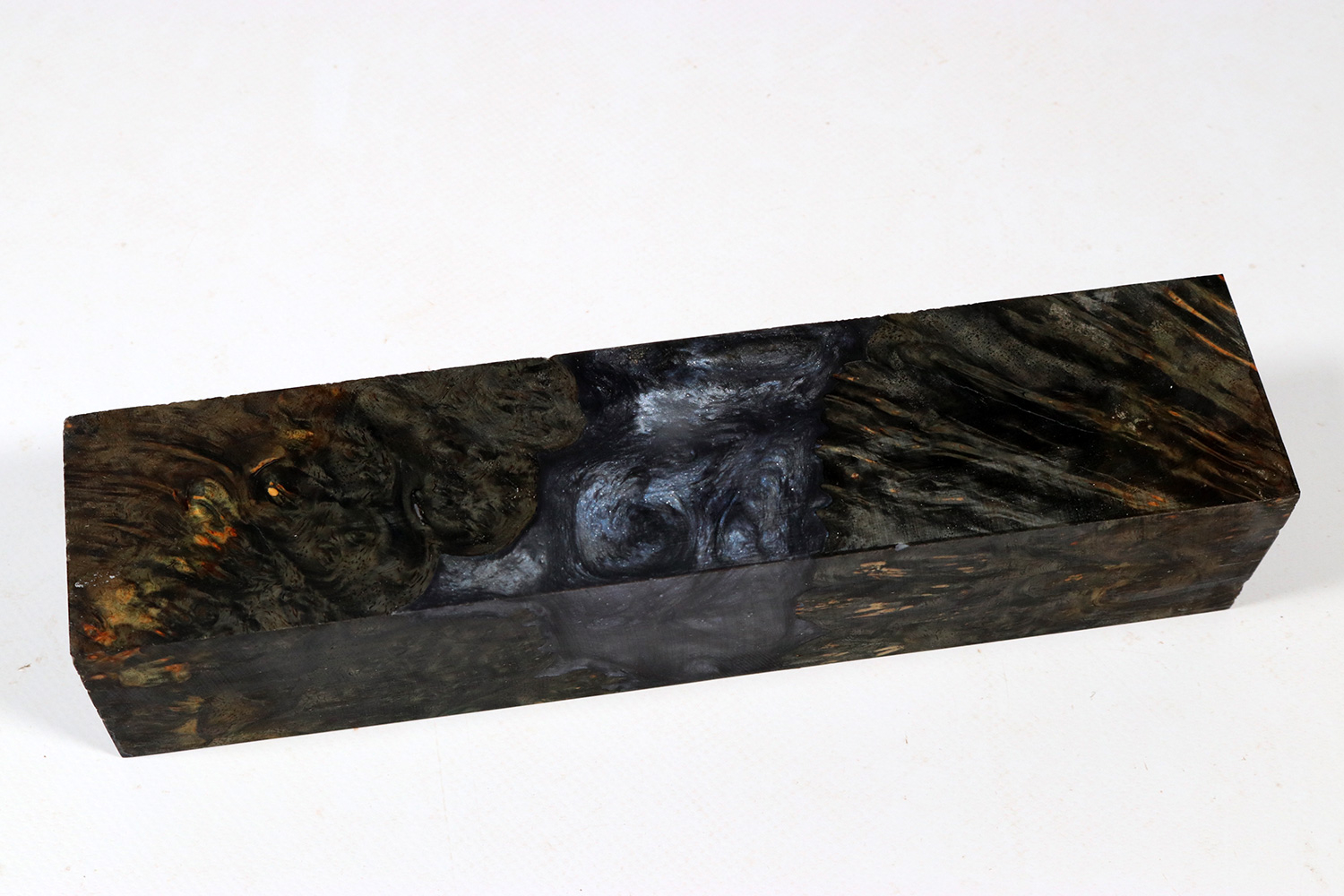 The wooden part of this block has been stabilized with Plexiglas® (PMMA) and fully penetrated. It will no longer absorb water, is dimensionally stable, and will no longer crack. It can be easily worked, but it does not react well to excessive heat during processing, so take care when sawing, drilling and grinding. (When it gets very hot - the melt point is at 90 Celsius - the PMMA begins to smear.)Very easily worked with sharp tools, but the odor stays within limits and is negligible. The stabilizing gives this block excellent hardness, durability, and stability. It is therefore suitable for heavy duty applications or in areas that get wet, such as outdoors.