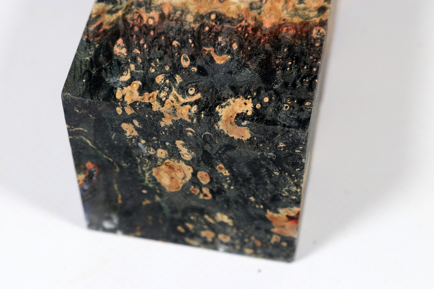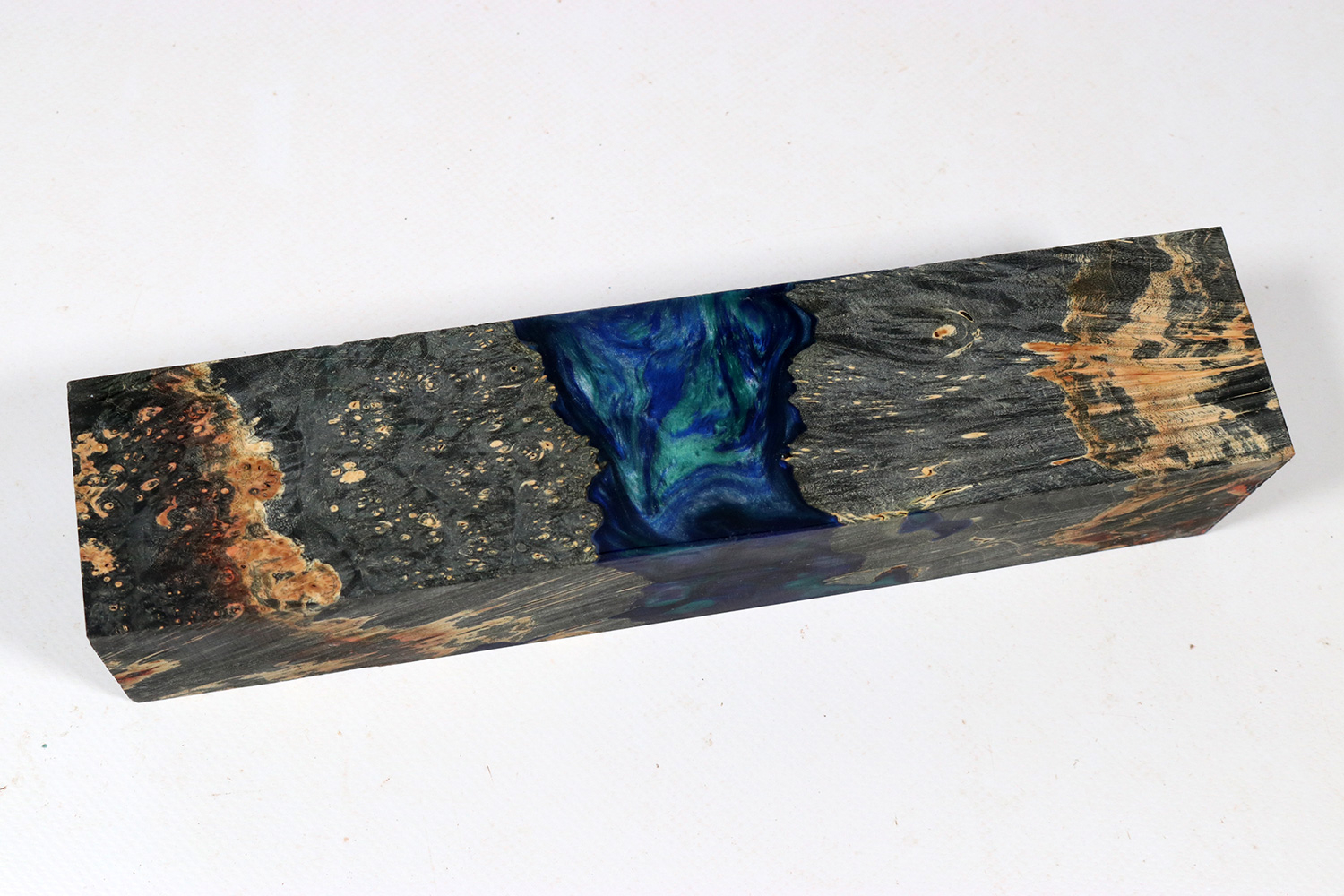 The wooden part of this block has been stabilized with Plexiglas® (PMMA) and fully penetrated. It will no longer absorb water, is dimensionally stable, and will no longer crack. It can be easily worked, but it does not react well to excessive heat during processing, so take care when sawing, drilling and grinding. (When it gets very hot - the melt point is at 90 Celsius - the PMMA begins to smear.)Very easily worked with sharp tools, but the odor stays within limits and is negligible. The stabilizing gives this block excellent hardness, durability, and stability. It is therefore suitable for heavy duty applications or in areas that get wet, such as outdoors.