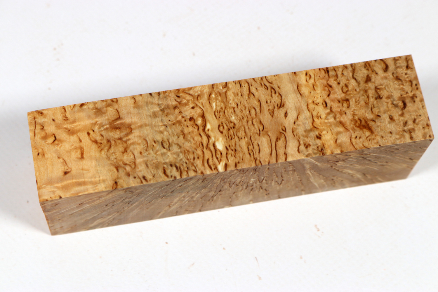 Karelian Masur Birch (Betula pendula var. carelica) ©Paul LenzThe Karelian masur birch (Betula pendula var. Carelica) occurs in Karelia, the border region between Russia and Eastern Finland. It is simply THE classic wood for Nordic knives of all kinds, such as the Sami knife. It cannot be used for much larger objects simply because of its rather small dimensions (the trunks are normally only 4-8 inches across). Trunks with good grains are relatively rare and are much sought after. The typical appearance in the form of brown veins is unique and is found in no other burl.