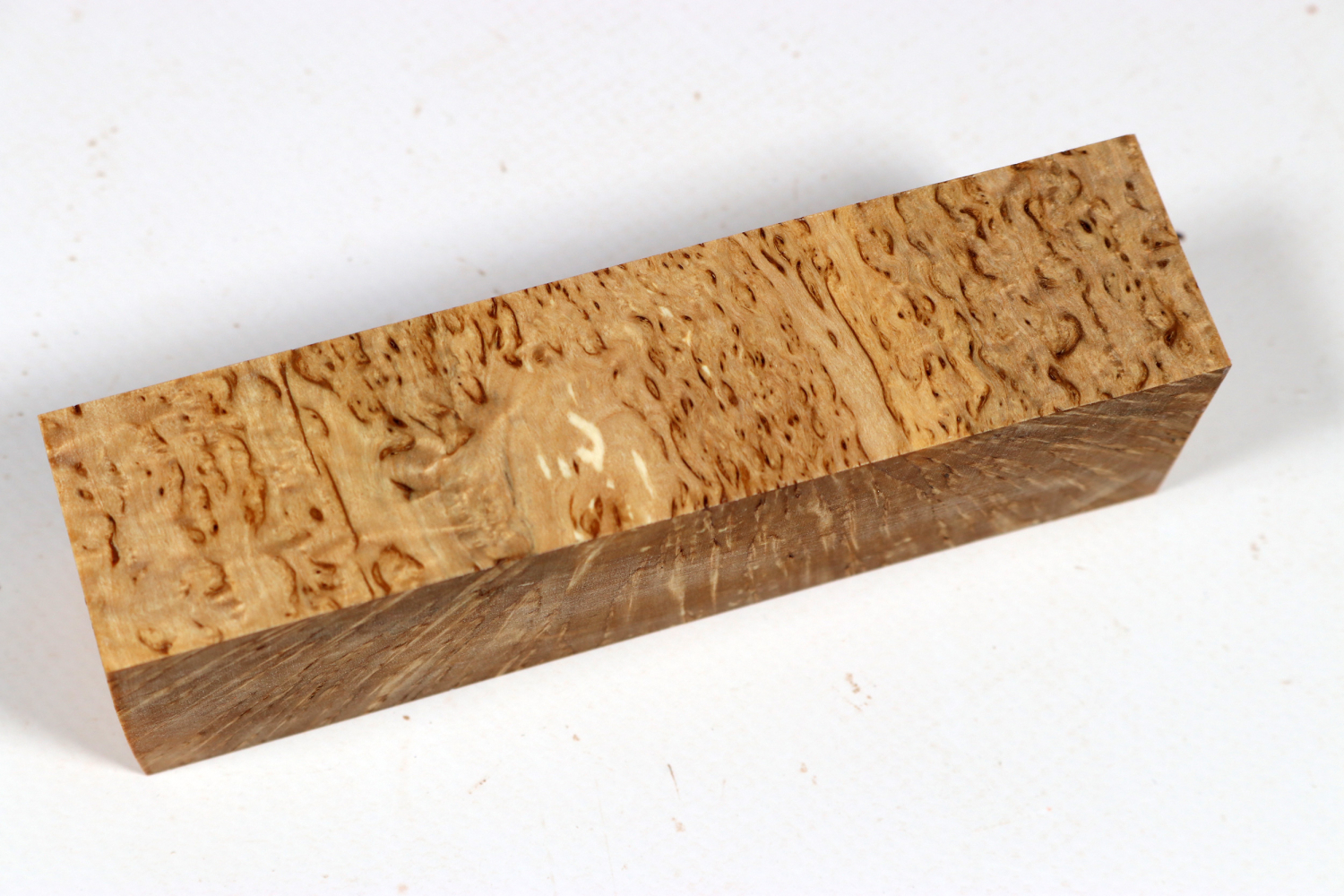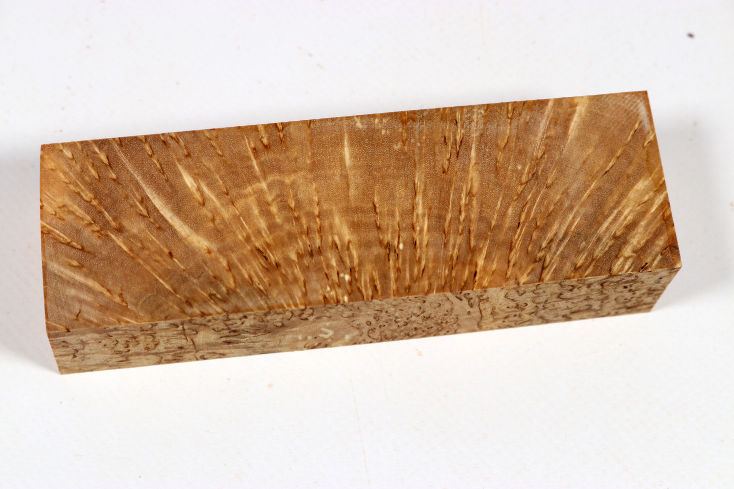 Karelian Masur Birch (Betula pendula var. carelica) ©Paul LenzThe Karelian masur birch (Betula pendula var. Carelica) occurs in Karelia, the border region between Russia and Eastern Finland. It is simply THE classic wood for Nordic knives of all kinds, such as the Sami knife. It cannot be used for much larger objects simply because of its rather small dimensions (the trunks are normally only 4-8 inches across). Trunks with good grains are relatively rare and are much sought after. The typical appearance in the form of brown veins is unique and is found in no other burl.