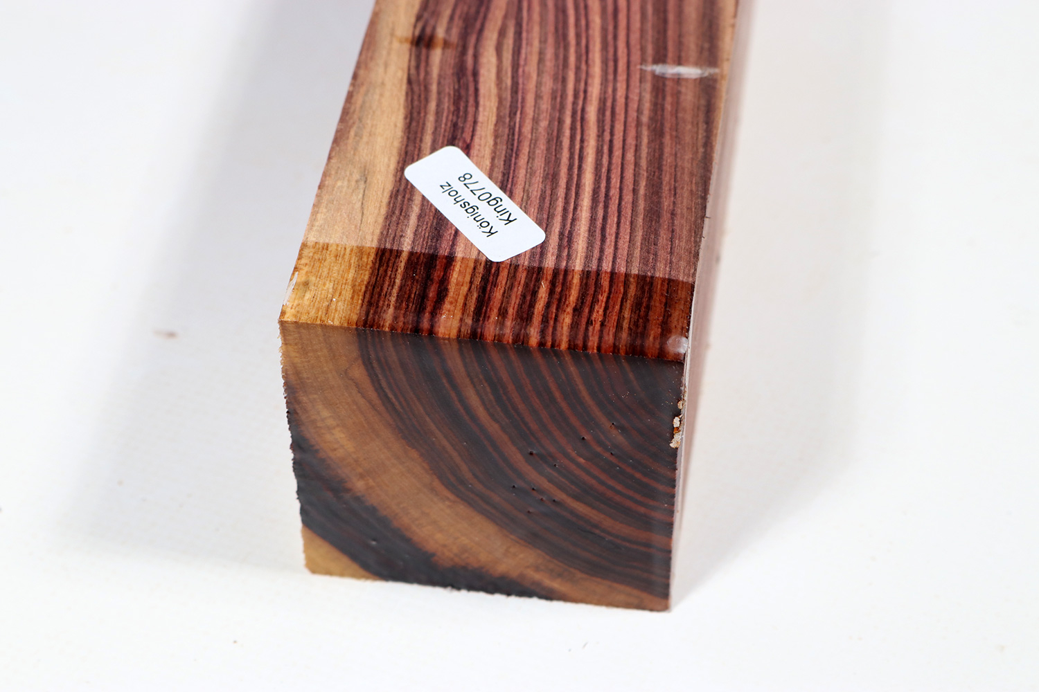 Kingwood (Dalbergia cearensis) is a particularly beautiful species of rosewood (Dalbergia). It comes from Brazil, mainly from the regions of Bahia, Ceará, Paraíba, and Pernambuco. It has a dark purplish color with light brown streaks. It is hard, dense, and is great for working and features a lovely scent. It does not like high temperature during processing (such as those produced by grinding) and it will respond with immediate darkening. It is a classic furniture wood, but is also used in musical instruments or other turning work.