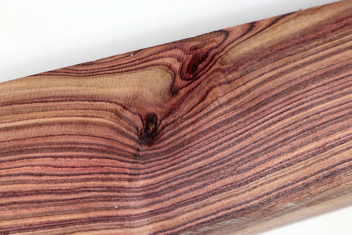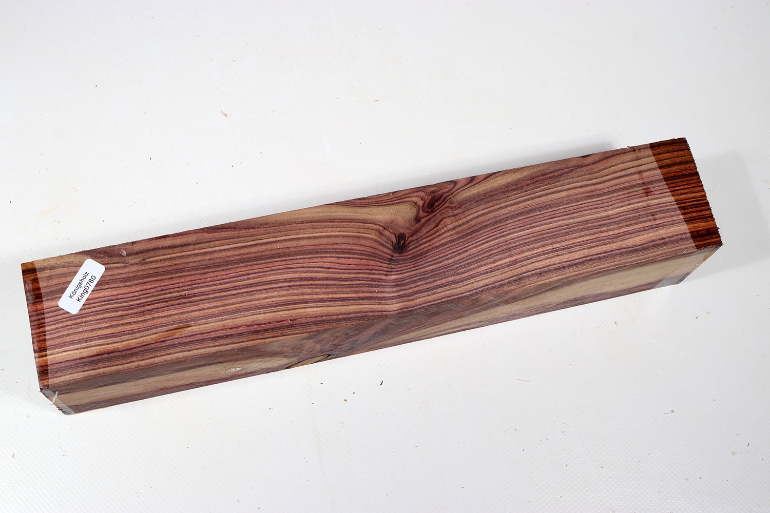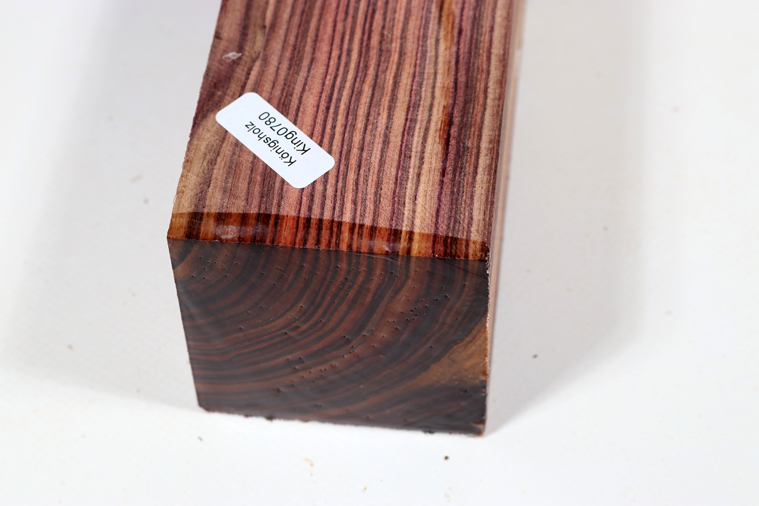 Kingwood (Dalbergia cearensis) is a particularly beautiful species of rosewood (Dalbergia). It comes from Brazil, mainly from the regions of Bahia, Ceará, Paraíba, and Pernambuco. It has a dark purplish color with light brown streaks. It is hard, dense, and is great for working and features a lovely scent. It does not like high temperature during processing (such as those produced by grinding) and it will respond with immediate darkening. It is a classic furniture wood, but is also used in musical instruments or other turning work.
