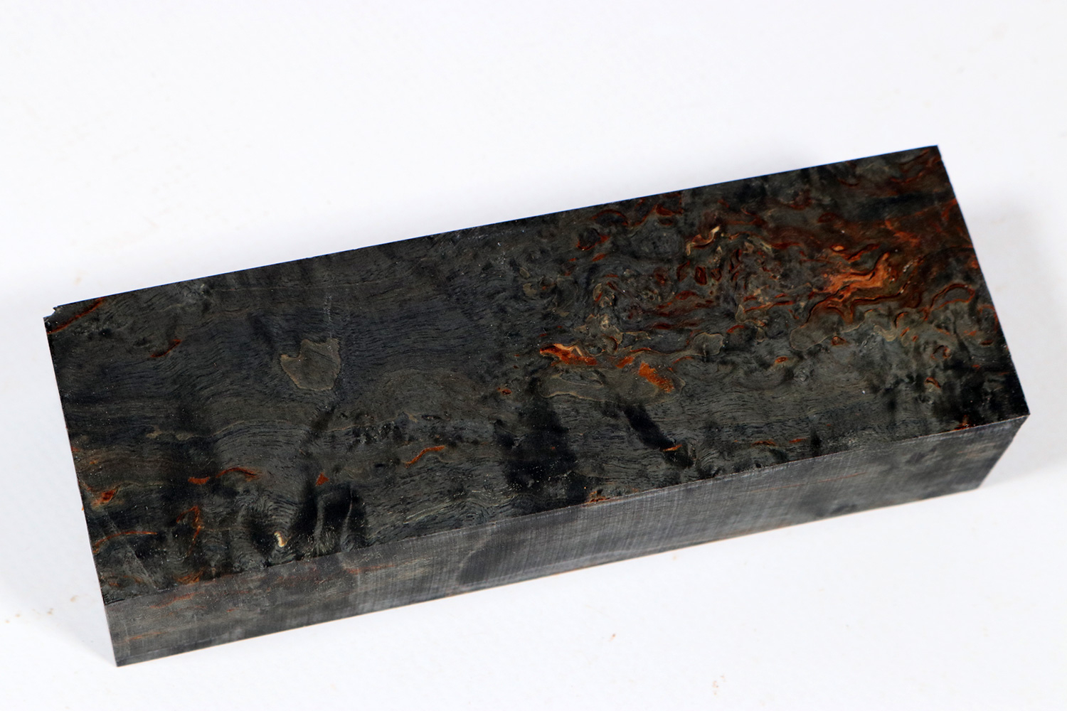 This knife block is stabilized with acrylic resin in a complex vacuum process and completely penetrated. It hardly absorbs any water, which means it is dimensionally stable and no longer cracks. Stabilized wood can be worked very well with sharp tools and behaves like hardwood. Stabilization results in very good hardness, stability and sturdiness. It is therefore also suitable for heavy use / damp areas, e.g. outdoors. Each type of wood absorbs a different amount of resin, of course, the most resinous woods.
