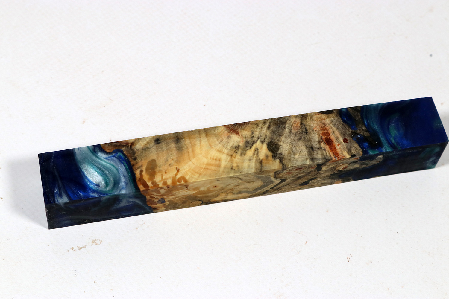 Hybrid wood consists partially of wood, and partially of different coloured acrylic resins. They are merged (cast) in a special process. The resulting hybrid material can be processed easily and is dimensionally stable. You may need to sharpen your tools quite often. In order to achieve great visual effects, partly ground mother of pearl shell is used, which can blunt sharp cutting tools faster than usual.