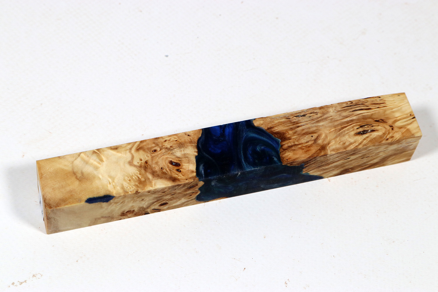 Hybrid wood consists partially of wood, and partially of different coloured acrylic resins. They are merged (cast) in a special process. The resulting hybrid material can be processed easily and is dimensionally stable. You may need to sharpen your tools quite often. In order to achieve great visual effects, partly ground mother of pearl shell is used, which can blunt sharp cutting tools faster than usual.