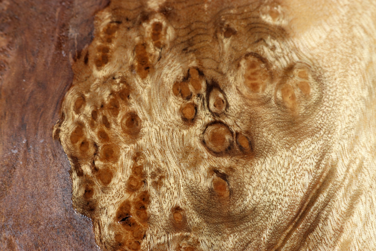 Golden Madrone (Nothaphoebe spp.) stammt aus Südostasien und ist eine Unterart der Lorbeerfamilie. Es ist am häufigsten in Indonesien, Malaysia, Vietnam, Kambodscha und Laos zu finden. Es hat einen subtilen Mentholgeruch, der beim Arbeiten wahrgenommen wird. Das dreidimensionale Erscheinungsbild der polierten Wurzel ist massiv und unverwechselbar mit einer Tiefe wie bei keinem anderen Holz. Das Kornwachstum ist relativ groß.