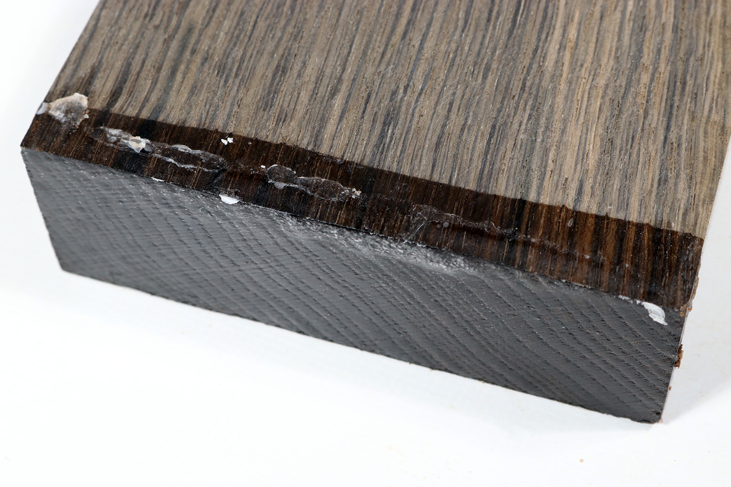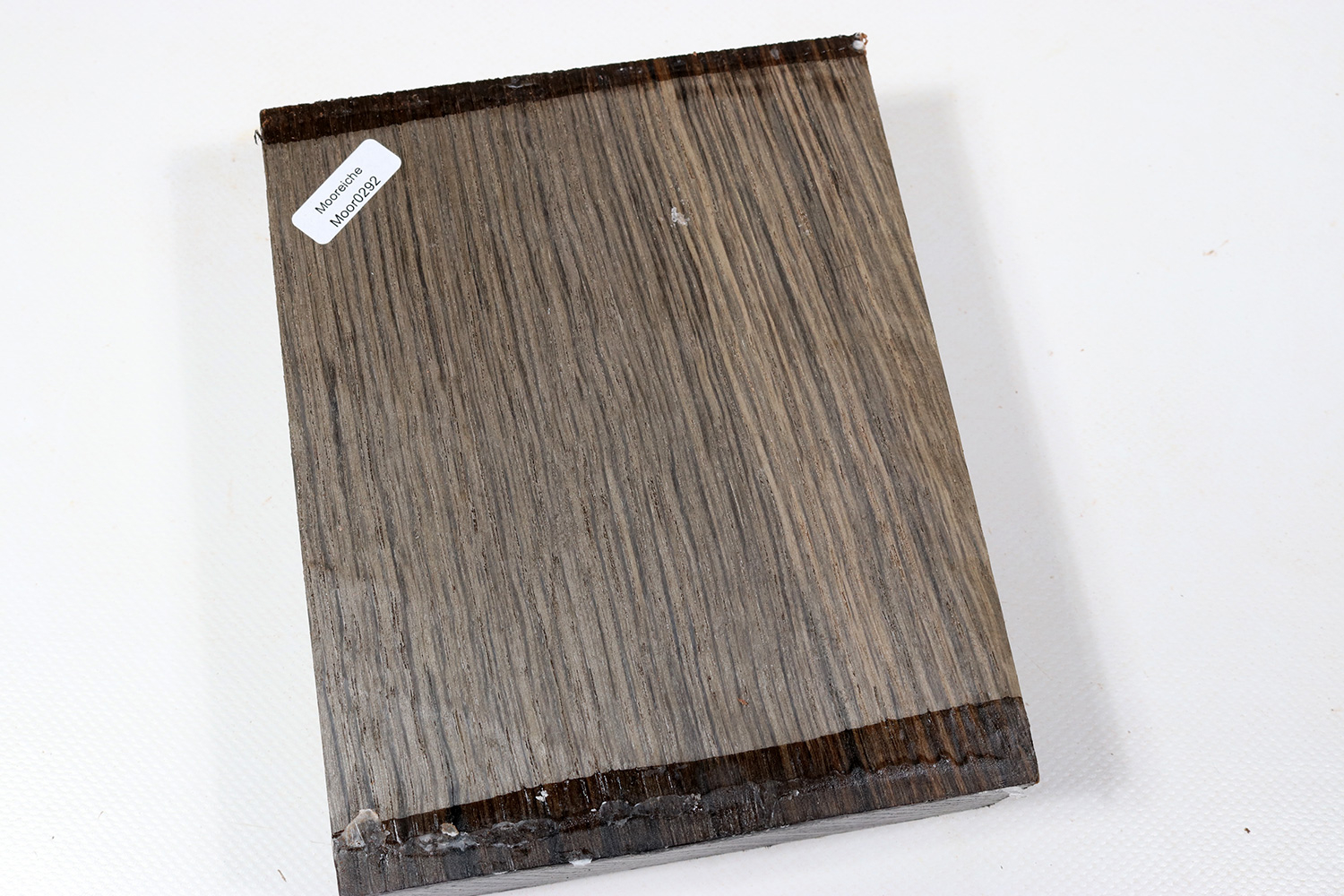 The bog oak (Quercus robur) is not a separate species from the English oak, but instead refers to logs that have spent centuries, even millennia in the anaerobic conditions of bogs and swamp. The tannic acid reacts with the iron salts contained in the water, which not only discolors the wood, but also makes it very hard. The coloration can be very irregular, varying from light grey to dark yellow, dark brown, or from blue-grey to deep black. These partially fossilized oaks can be between 600 and 8,500 years old.