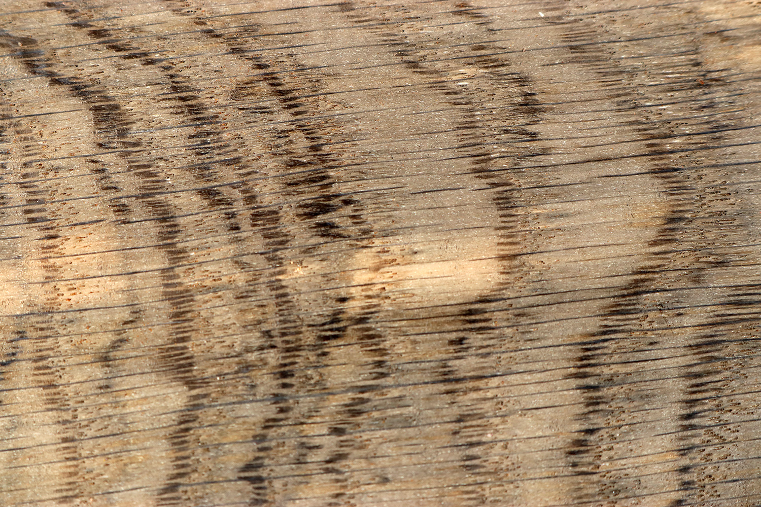 The bog oak (Quercus robur) is not a separate species from the English oak, but instead refers to logs that have spent centuries, even millennia in the anaerobic conditions of bogs and swamp. The tannic acid reacts with the iron salts contained in the water, which not only discolors the wood, but also makes it very hard. The coloration can be very irregular, varying from light grey to dark yellow, dark brown, or from blue-grey to deep black. These partially fossilized oaks can be between 600 and 8,500 years old.