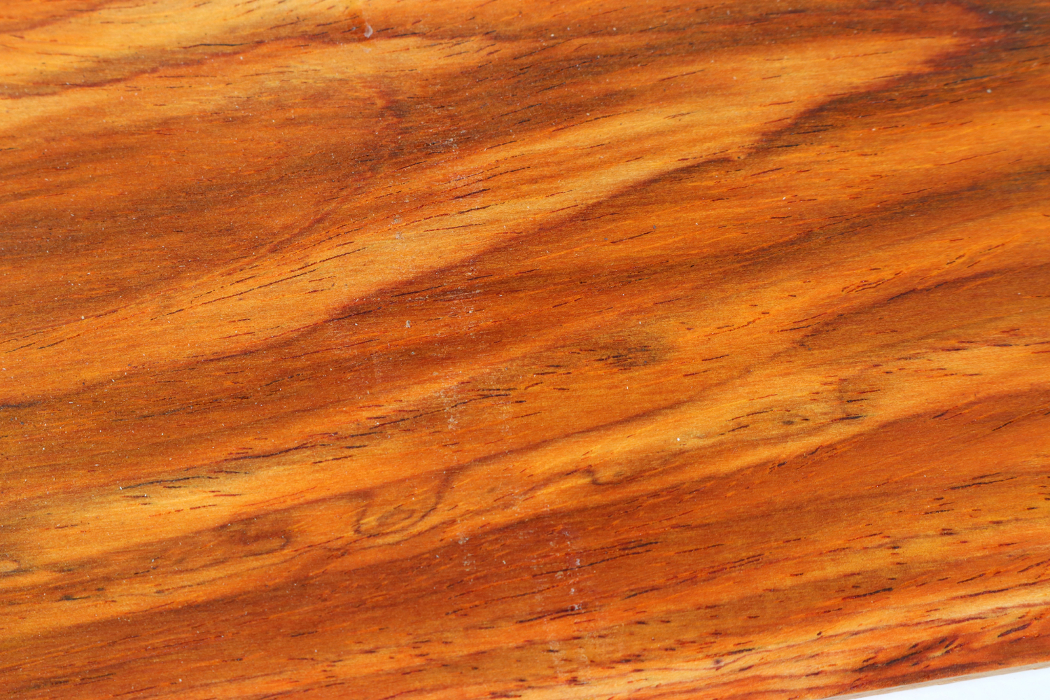 Cocobolo (Dalbergia retusa) comes from Central America and grows along the Pacific coast, but mainly in Nicaragua. It is a true rosewood and has the highest fat content of its kind. Often it just needs a polish without any other surface treatment. Only the heartwood is used; when freshly cut, it can range from a dark orange to a deep red. Although the pale yellow sapwood can be a very nice contrast. The wood darkens over time and under the influence of UV light.