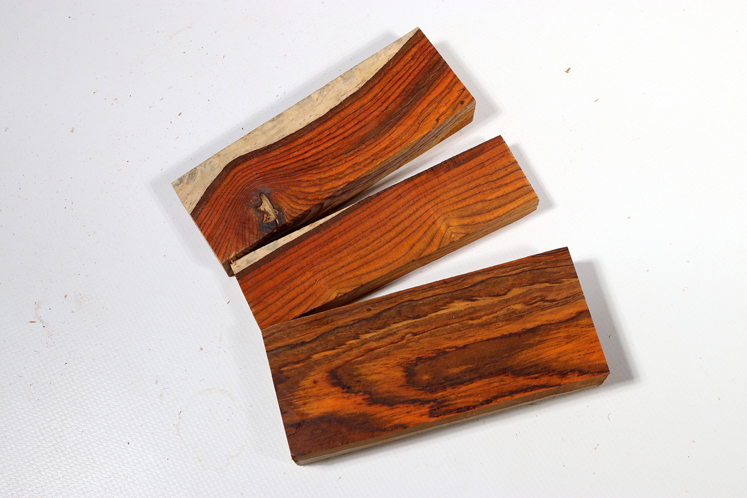 Cocobolo (Dalbergia tucurensis) comes from Central America and grows along the Pacific coast, but mainly in Nicaragua. It is a true rosewood and has the highest fat content of its kind. Often it just needs a polish without any other surface treatment. Only the heartwood is used; when freshly cut, it can range from a dark orange to a deep red. Although the pale yellow sapwood can be a very nice contrast. The wood darkens over time and under the influence of UV light.