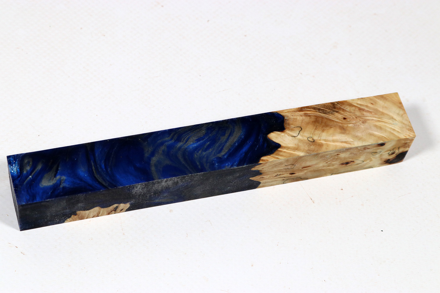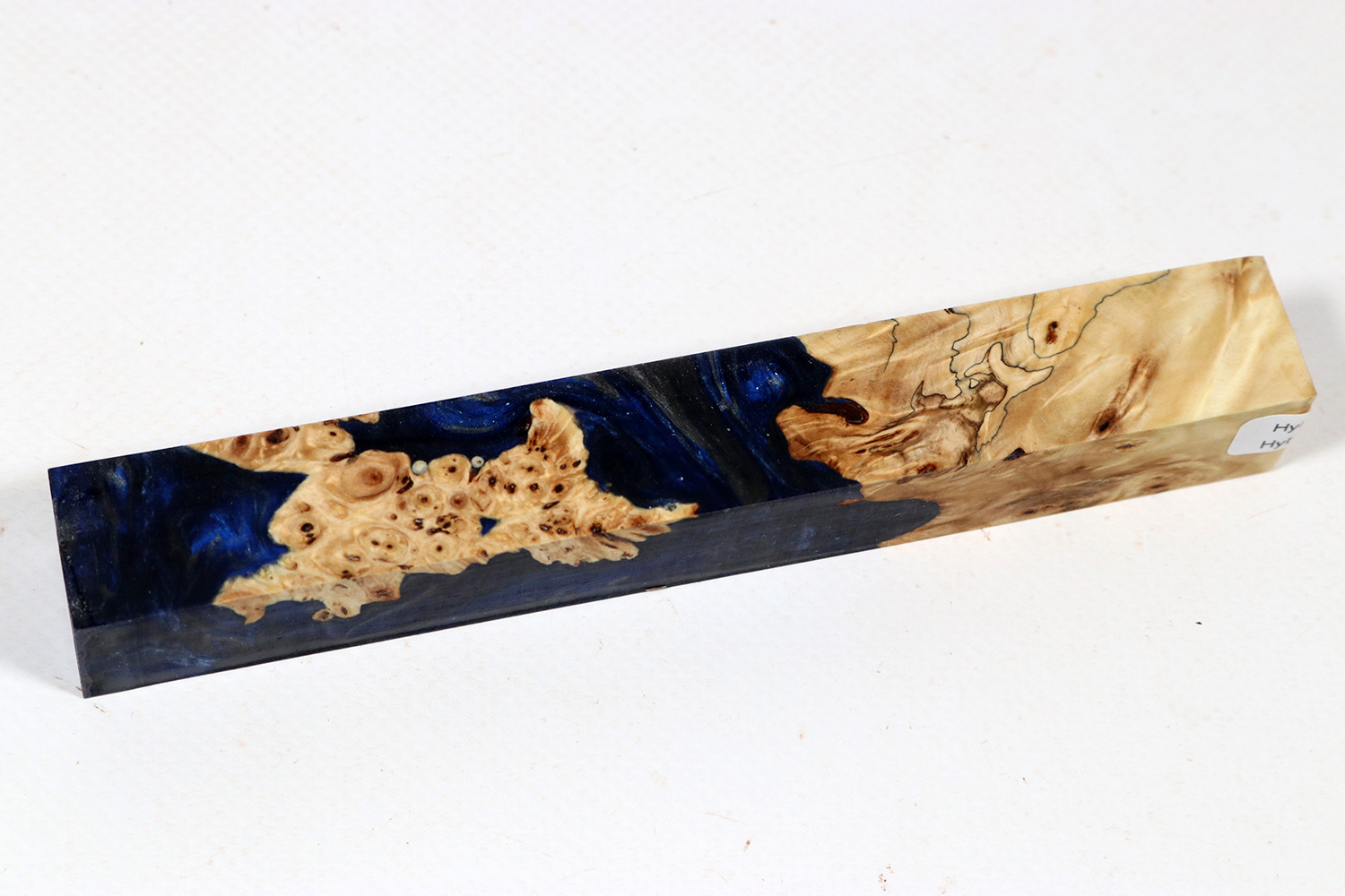 Hybrid wood consists partially of wood, and partially of different coloured acrylic resins. They are merged (cast) in a special process. The resulting hybrid material can be processed easily and is dimensionally stable. You may need to sharpen your tools quite often. In order to achieve great visual effects, partly ground mother of pearl shell is used, which can blunt sharp cutting tools faster than usual.