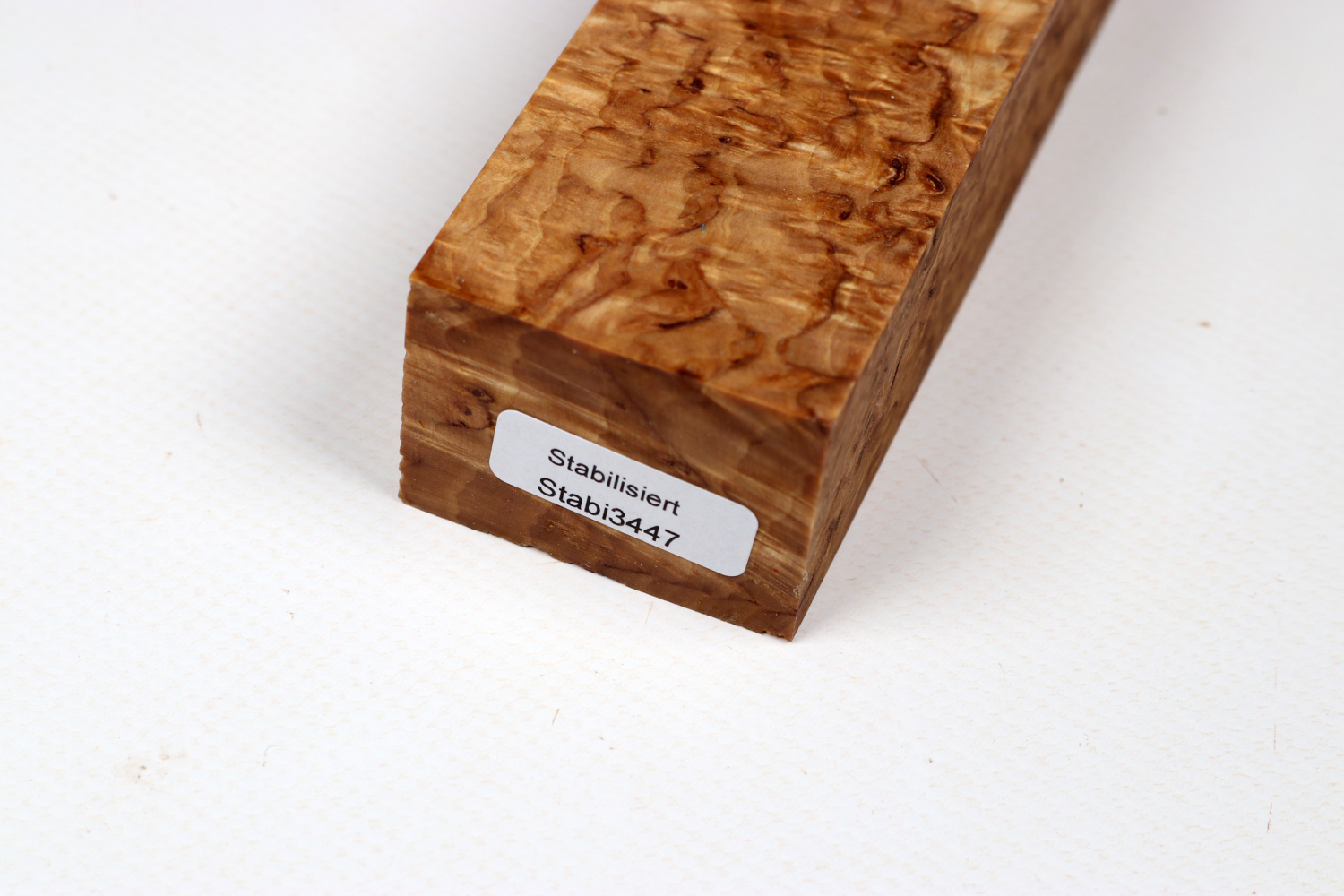 This knife block is stabilized with acrylic resin in a complex vacuum process and completely penetrated. It hardly absorbs any water, which means it is dimensionally stable and no longer cracks. Stabilized wood can be worked very well with sharp tools and behaves like hardwood. Stabilization results in very good hardness, stability and sturdiness. It is therefore also suitable for heavy use / damp areas, e.g. outdoors. Each type of wood absorbs a different amount of resin, of course, the most resinous woods.